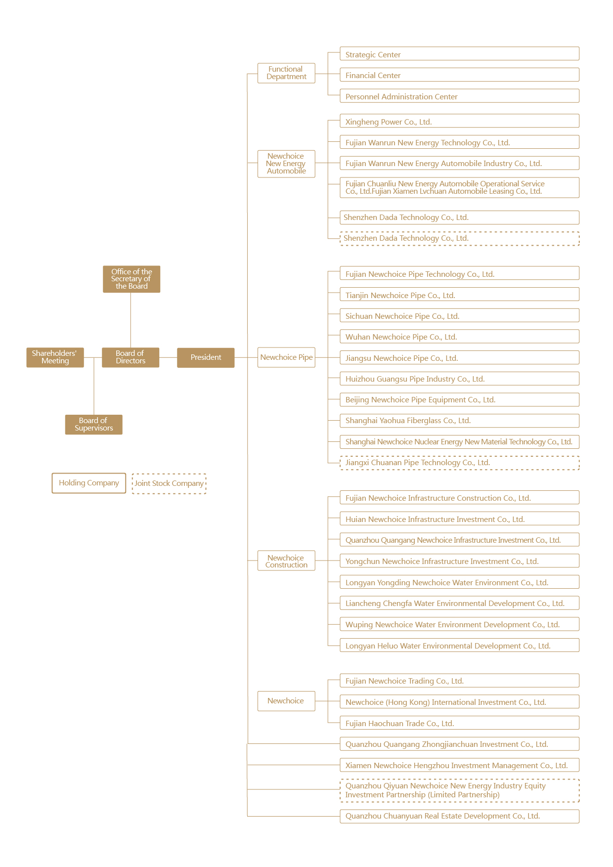 Founded in Quangang District of Quanzhou City, Fujian in 2003, Fujian Newchoice Pipe Technology Co., Ltd. (300198) is a domestically leading high-tech and environment protection industry group, specialized in business fields like new energy automobile, PPP investment and construction,green and environment-friendly pipes, and bulk trade. Now it has 31 member enterprises.
