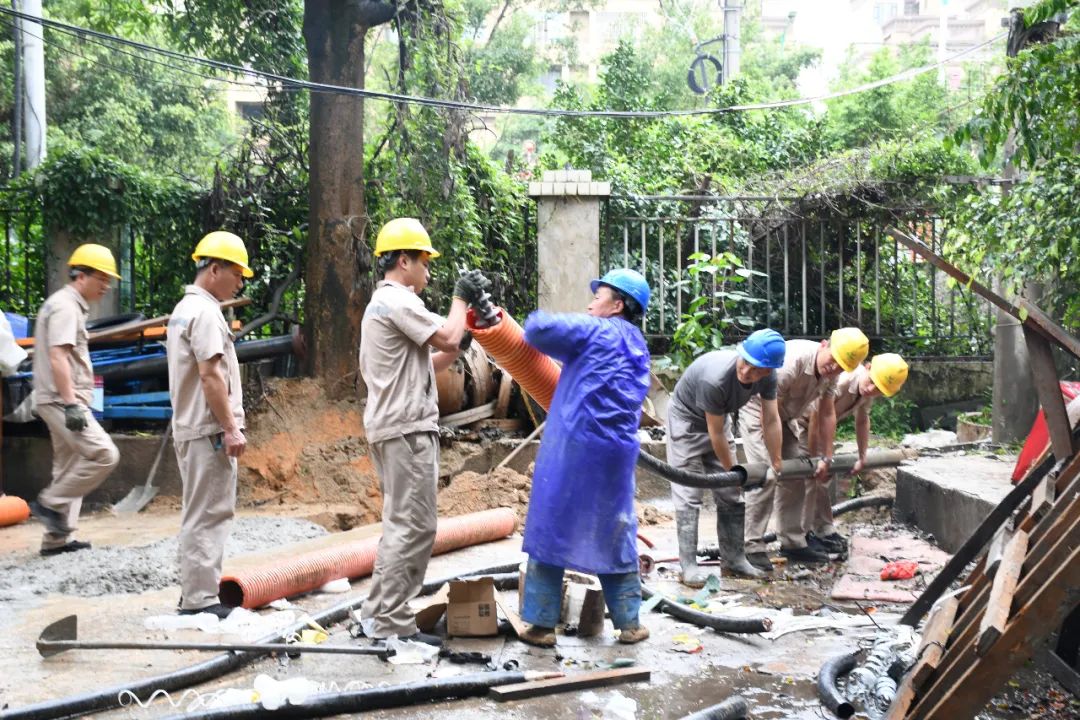 集團行政部、管業車間及設備部及時聯系、溝通,組織維修技術人員立即奔赴現場,迅速投入到電力設施搶修工作中。時間緊迫、暴雨天氣給搶修工作帶來了難度,集團總經辦緊急查找檔案室中,當年施工圖紙,有力保障搶修效率與時間,全體成員克服困難,堅守一線、有序分工,技術人員反復地檢查、調試電力設施,現場進行重新規劃,用最短的時間和距離,完成開挖和主電纜鋪設。